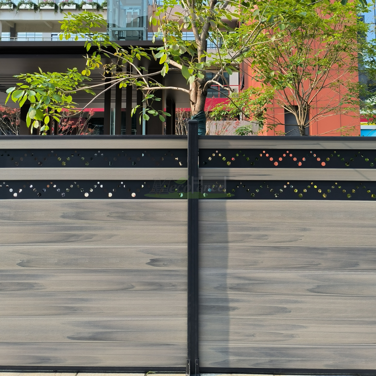 MecoFence Carved Composite Fence Where Precision Engineering Meets Artistic Design Product Model S-CF 05 Certifications CE, ISO, FSC Size 1.8*1.8m (6*6ft) DIY board options Circle,Snow,Wave,Leaf,Tree